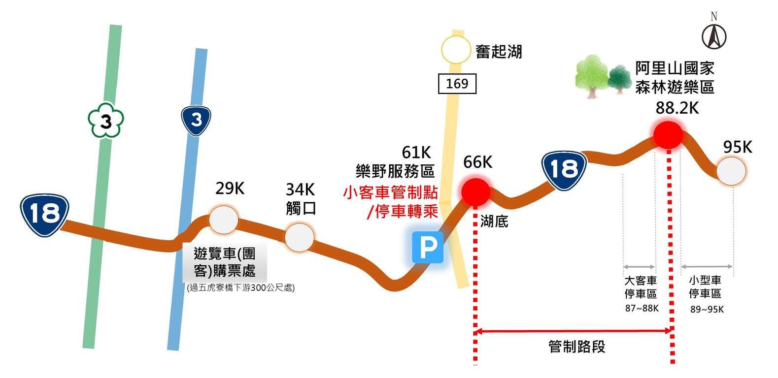「114年阿里山櫻花季」疏運管制期間,台18線66k湖底至88.2k阿里山森林遊樂區路段禁行小型車。